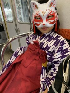 はいからさん×ねこ?キツネ?のお面で登校しました。